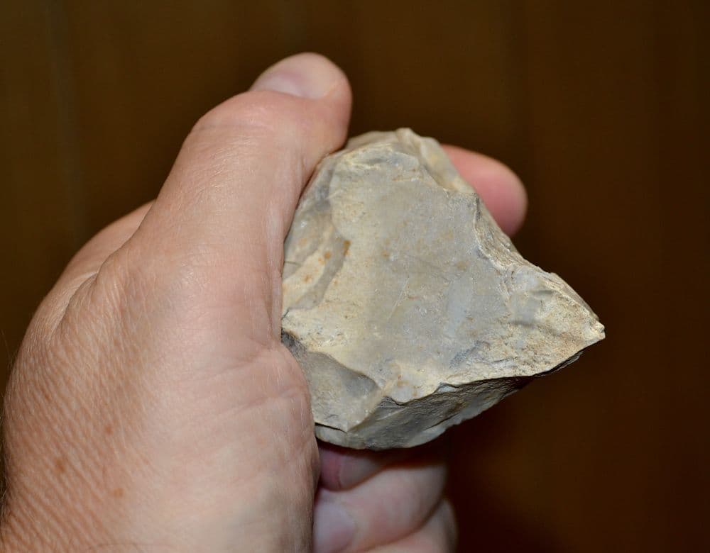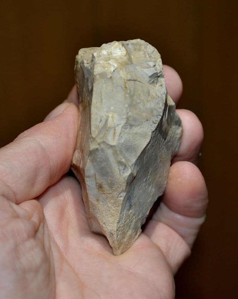 c.300,000 to 200,000 BC. A good Mid-Palaeolithic heavy butted, pointed flint hand axe found some years back at Overstrand, Near Cromer, North Norfolk and from an old Norfolk collection. Nicely worked from a large thick whitish grey coloured flint flake. Bifacially worked with a well defined axe point. Intact and in nice overall condition. A good, affordable early pointed hand axe, approx. 85mm long x 65mm wide x 45mm thick