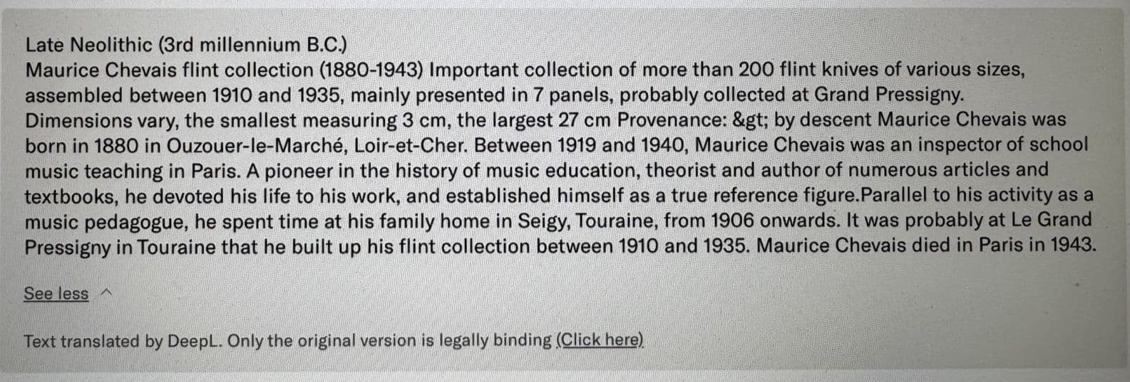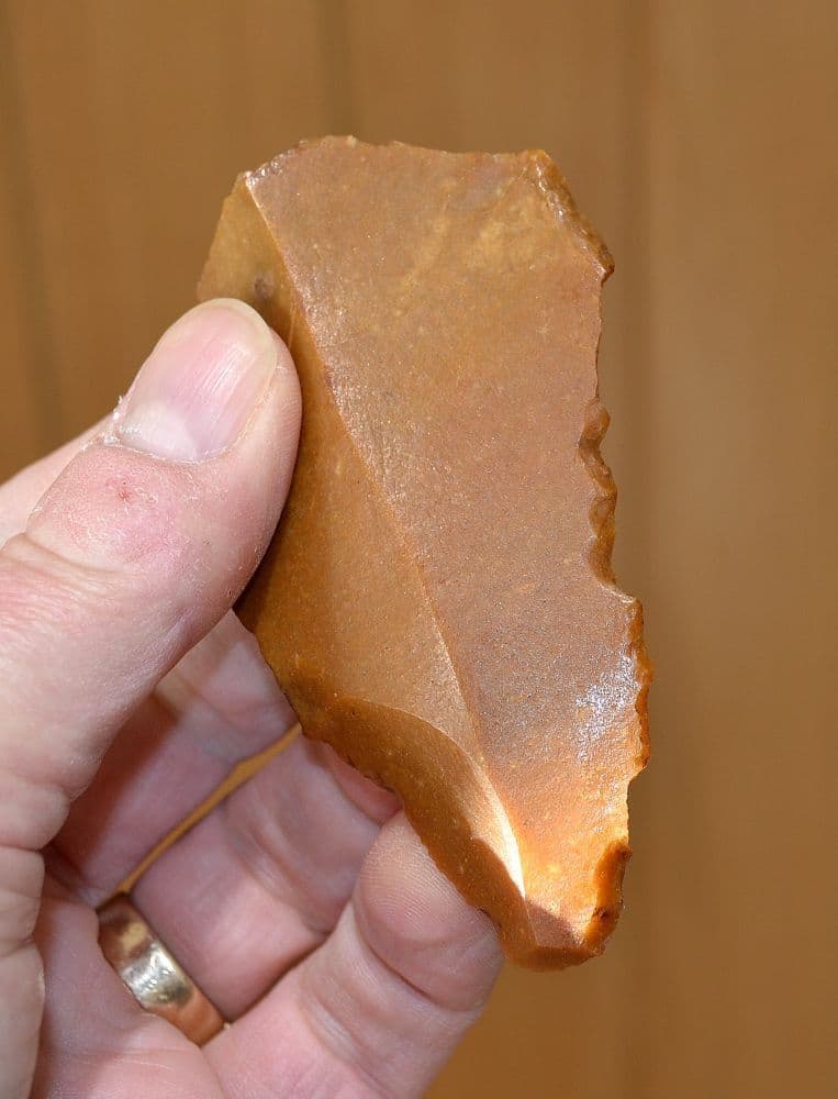 Neolithic period c.4000-3200 B.C. A large & excellent Neolithic flint Saw / Scraper found in the early 20th Century at the very famous Prehistoric site of Le Grand Pressigny, Touraine, France. Ex. Maurice Chevais Collection [Maurice Chevais (1880-1943) was a French composer and Inspector of School music teaching in Paris, a pioneer in the history of music teaching in fact and keen collector of French Lithics]. His huge prehistoric collection was amassed from 1910-1935 on his regular visits to the family home near Le Grand Pressigny. This attractive scraper is fashioned from the most attractive Honey / Toffee coloured flint, so synonymous with the area. Largely flat underside but worked on upper surface to form a distinct medial ridge with slightly denticulated blade edges being fashioned either side so could have been used for sawing, cutting or scraping hides to make clothing. Totally intact and in excellent condition with a lovely "old collection" shiny surface patina, A good sized Neolithic flint Saw / Scraper from both a very notable location and collection, Approx. 97mm long x 65mm at widest x 20mm at thickest