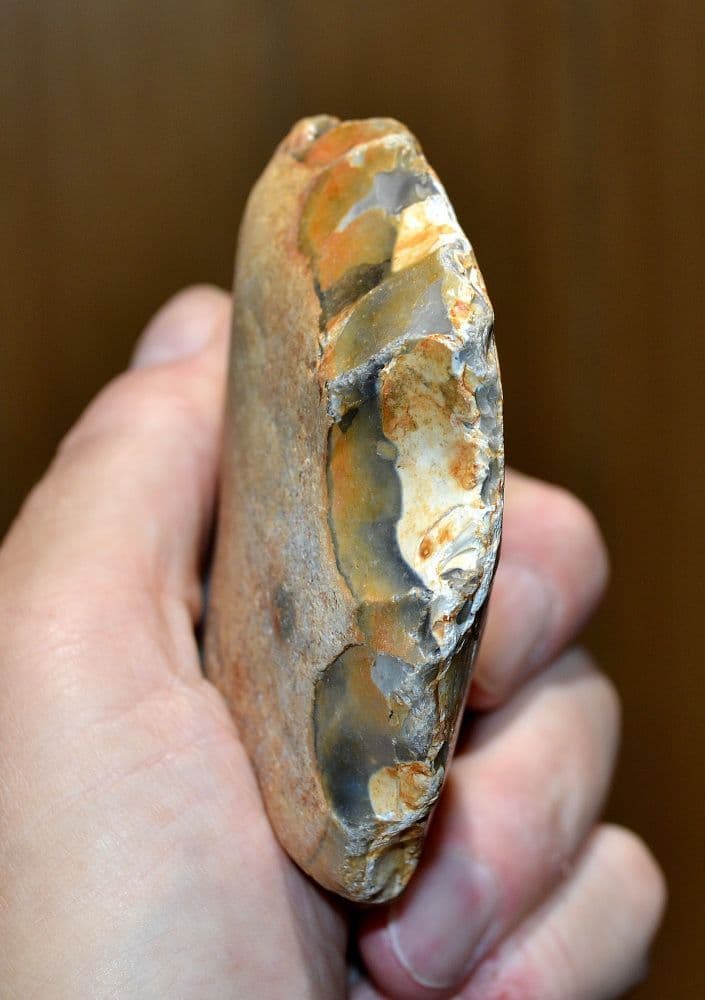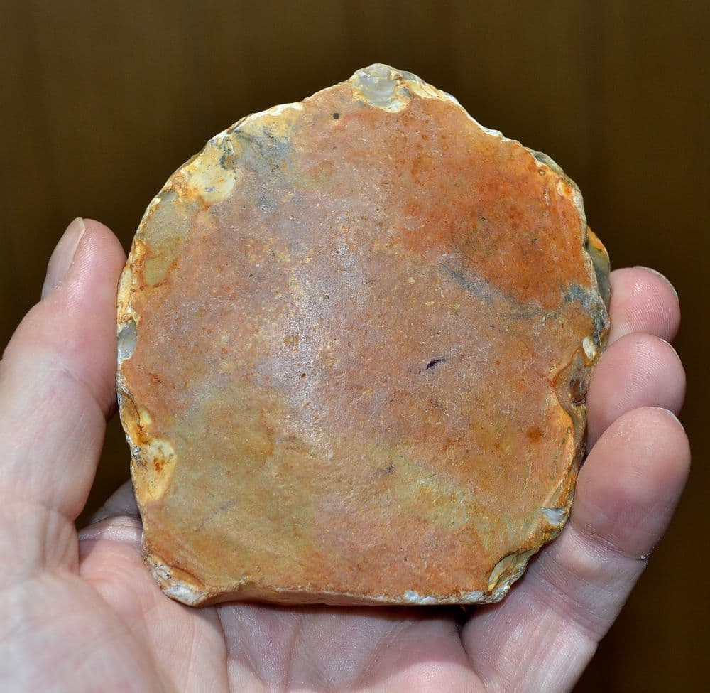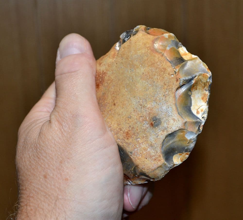 Anglian to Hoxnian strata c.524,000 to 424,000 BC (MIS13-11). A large and attractive Lower Paleolithic Unifacial Ovate Hand Axe from a famous Lower Prehistoric site at Whitlingham just outside Norwich, Norfolk. From an old Norfolk collection. Skillfully fashioned from a large ovate flint flake, main face of Hand Axe still with original pebble cortex intact and then nicely worked around its upper edge with five major flake removals forming a distinct, functional and almost denticulated main cutting / chopping blade. A further nice addition is a small Fossil shell imprint to left side of axe. Totally intact with a most appealing attractive old Paleolithic colouration and an attractive shiny surface patination to worked faces, a very tactile and appealing example of a large early Paleolithic Hand Axe from a notable site, 98mm long x 94mm wide x 30mm thick