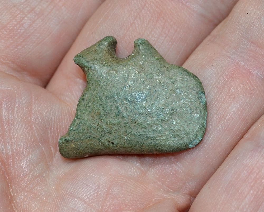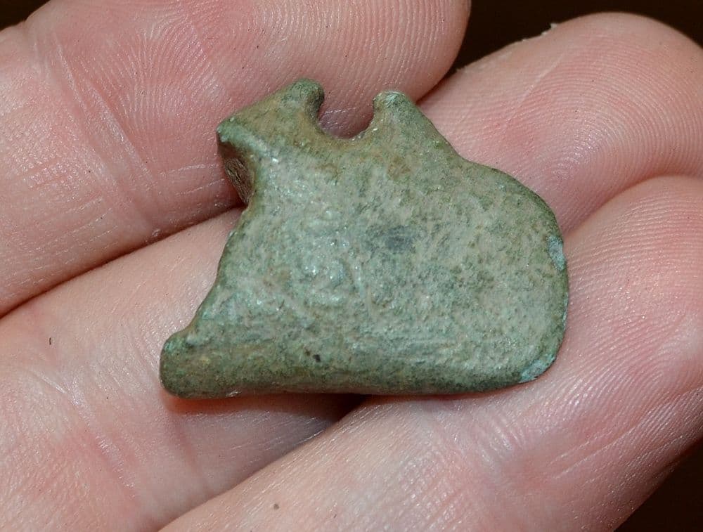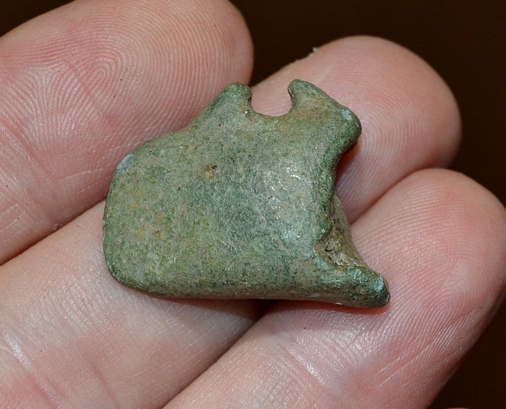 c.1200-800 B.C. A particularly large and scarce Late Bronze age votive Axe / Pendant found many years back in Buckinghamshire and from an old London collection. A miniature solid bronze version of a Late Bronze age socketed and looped axe head, made either for votive deposition at a sacred site or possibly even worn round the neck on a thong as a protective amulet. Some old loss from the socket end and small piece missing from suspension loop otherwise intact and in nice overall condition with good surfaces and a pleasant light green patina, a pleasant and larger than usual example, 28mm long x 23mm high x 8mm thick
