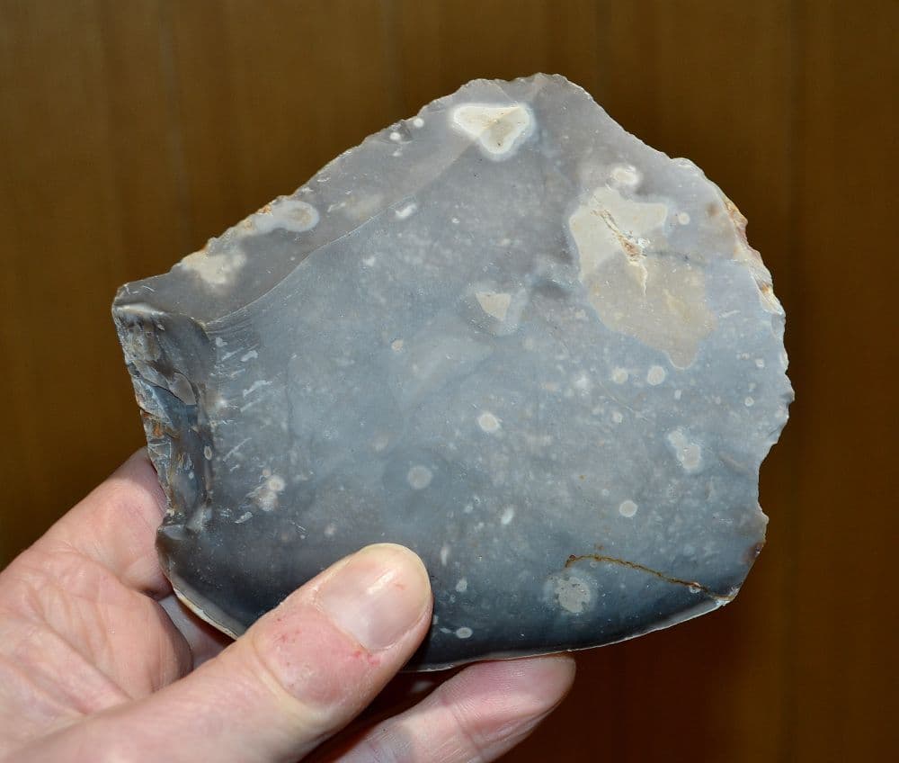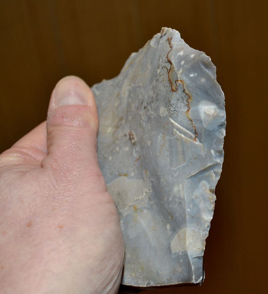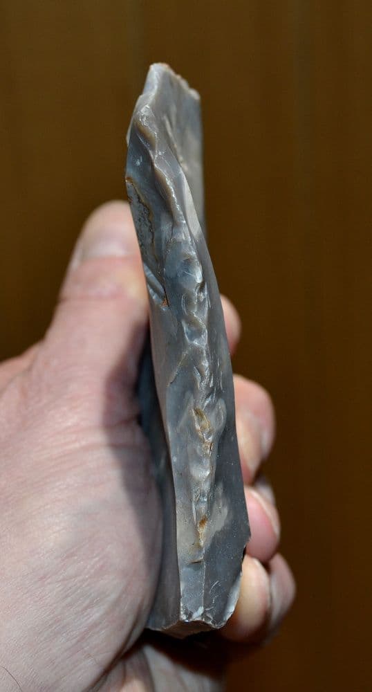 Site occupied and dated to 65,000 to 57,000 years ago. A large Palaeolithic (Neanderthal) flint flake knife tool found many years back close to the now famous Palaeolithic Neanderthal habitation site of Lynford Quarry, Norfolk.[This famous and well documented site sat on the edge of an ancient channel of water where Neanderthals thrived and hunted. When excavated many years back, hundreds of flint tools were unearthed alongside thousands of butchered bones and teeth of Mammoths, Woolly Rhinos and Deer. The quarry is now a nature reserve owned by English Heritage so tools can no longer be unearthed here, so this is a rare opportunity to obtain a good Neanderthal flint tool from a notable site]. Fashioned from a large flake of mottled grey flint and well worked along one side to form a still sharp almost convex main cutting edge with some lighter reworking evident to further enhance or re-hone the blade edge. The thicker side of the flake makes a good grip for the tool and still has some original pebble cortext on its end. Intact and in very nice overall condition, with good surface ageing. A much larger than normal example of a Neanderthal Flake knife from a notable site, 130mm long x 120mm wide x 22mm at thickest (grip end)