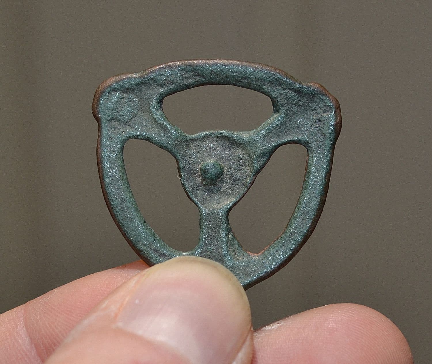 c.9th/10th Century A.D. A large,excellent and attractively patinated Viking Tri-sided ornate strap junction. From an old U.S. collection and collected in the 1990's. A robust and attractive item with three leather strap apertures, each segment divided by a bulbous terminal and also featuring a raised central decorative boss. Totally intact, in lovely condition with a most attractive overall deep green patination, a very appealing and tactile Viking artefact, 38mm x 38mm.