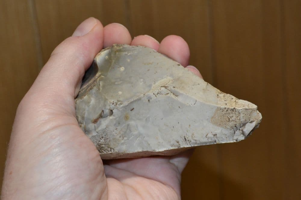 Hoxnian Interglacial Period c.424,000 to 374,000 B.C. A large Lower Palaeolithic Unifacial flint hand axe found some years back at Overstrand, Near Cromer, North Norfolk and from an old Norfolk collection. Nicely worked from a large thick flake of light and dark grey flint taken from the outer edge of a large flint pebble and still has pebble cortex evident on the unworked side of the hand axe to aide grip in use. Clearly worked on other side to form a sharp blade edge on one side plus a good functional point. Intact and in nice overall condition. A good and sizable Palaeolithic hand axe, approx. 125mm long x 63mm wide x 55mm at thickest