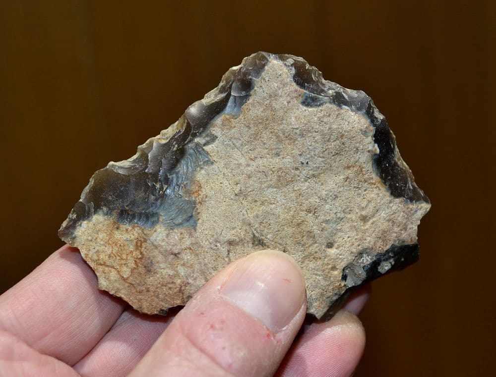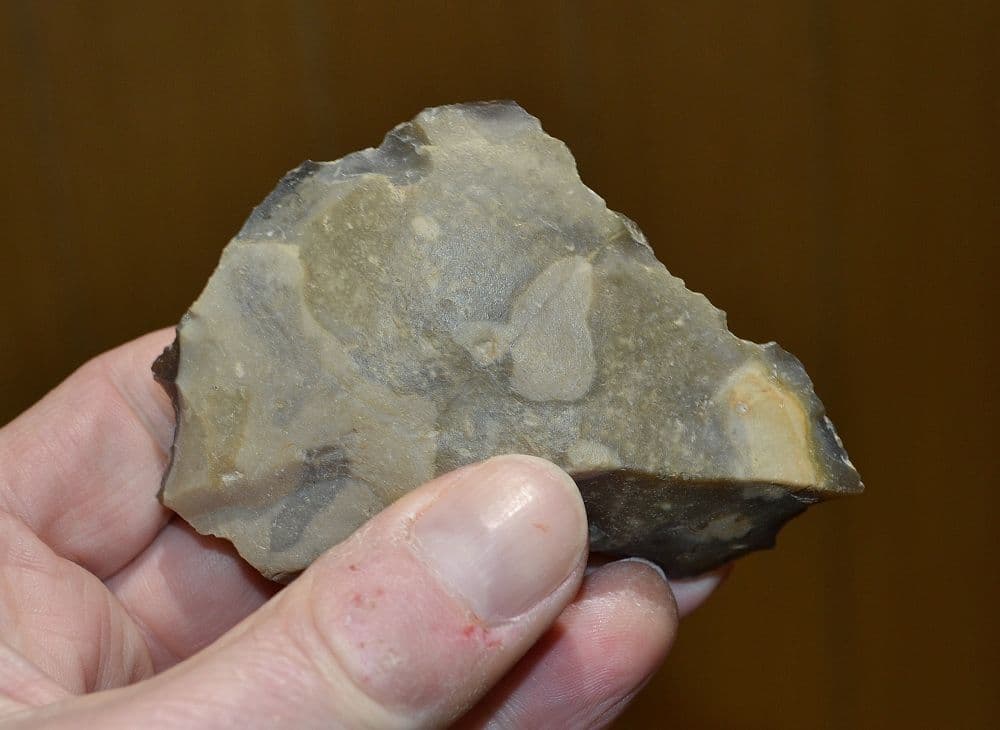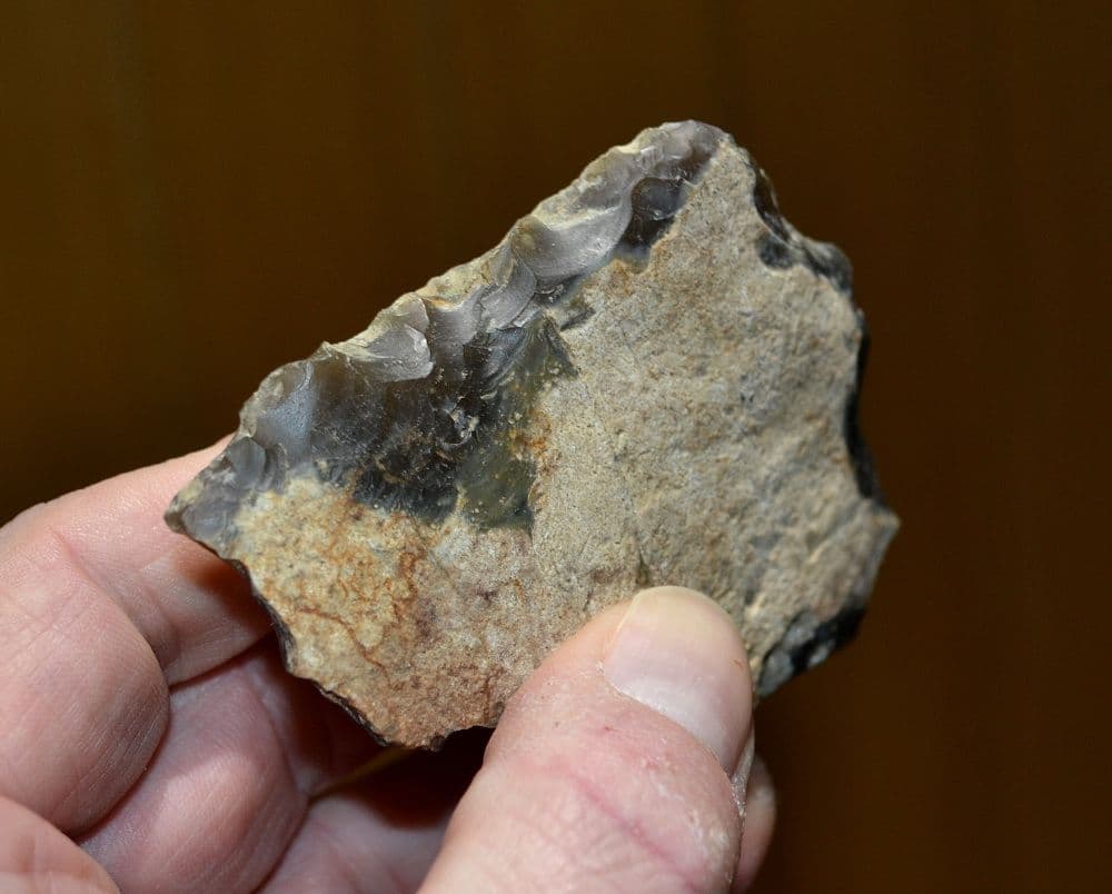 Site occupied and dated to 65,000 to 57,000 years ago. A pleasant Palaeolithic (Neanderthal) flint flake knife tool found many years back close to the now famous Palaeolithic Neanderthal habitation site of Lynford Quarry, Norfolk.[This famous and well documented site sat on the edge of an ancient channel of water where Neanderthals thrived and hunted. When excavated many years back, hundreds of flint tools were unearthed alongside thousands of butchered bones and teeth of Mammoths, Woolly Rhinos and Deer. The quarry is now a nature reserve owned by English Heritage so tools can no longer be unearthed here, so this is a rare opportunity to obtain a good Neanderthal flint tool from a notable site]. Fashioned from an outer flake of dark & light grey flint, largely smooth underside, pebble cortex over much of the upper surface and then well worked along two edges to form distinct functional cutting / sawing blade edges. Intact and in very nice overall condition, with good surface ageing. A pleasant example of a Neanderthal Flake knife from a notable site, 93mm long x 68mm wide x 23mm at thickest (grip end)