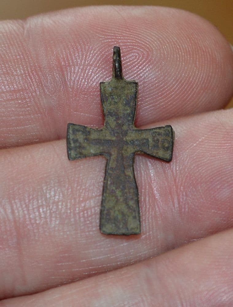 c.1500-1600 A.D. A pleasant Post Medieval bronze Crucifix (Cross) pendant, European in origin but from a Suffolk collection. Engraved and stylised nested Cross design on either side and a large suspension loop at the top. Probably once silvered or gilded but now merely bronze in appearance. Some light surface wear from its time buried in the Earth but otherwise totally intact and in nice overall condition, still wearable if required, 27mm high, 15mm wide
