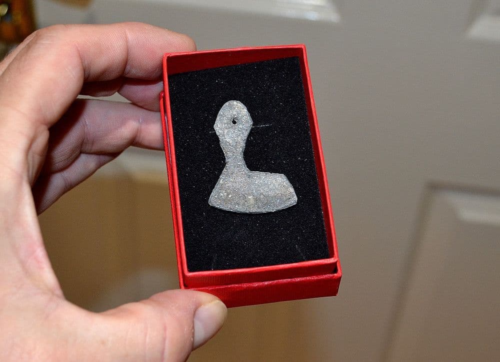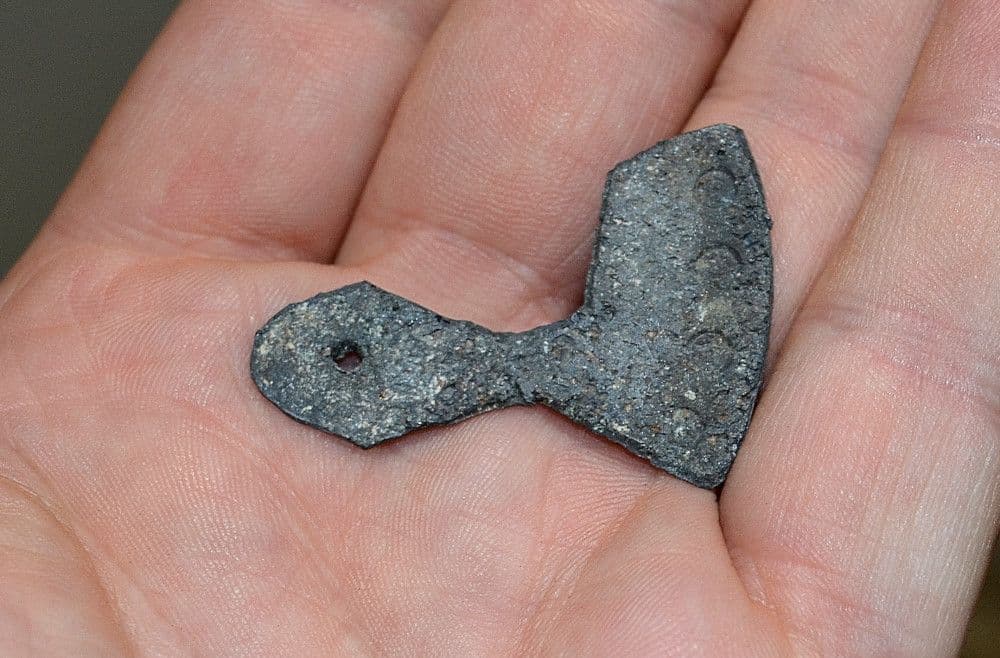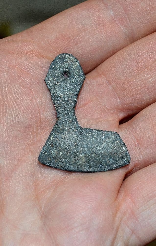 c.8th-10th Century A.D. A rare and unusual Viking lead Bearded Axe pendant, excavated in Northern Europe many years back and from a Norfolk collection. Expertly fabricated from a hammered lead sheet and cut to form the Bearded Axe shape with 4 circular punch marks then placed along blade edge on either side, as some form of rudimentary decoration. Small suspension hole punched at top; possibly once on a small suspension loop, now lost but could be mounted onto another loop and worn again if so desired. Totally intact and in very good condition for Ancient lead with a light whitish surface patination, box40mm long x 29mm wide, supplied in display box, a rare and unusual Viking lead pendant