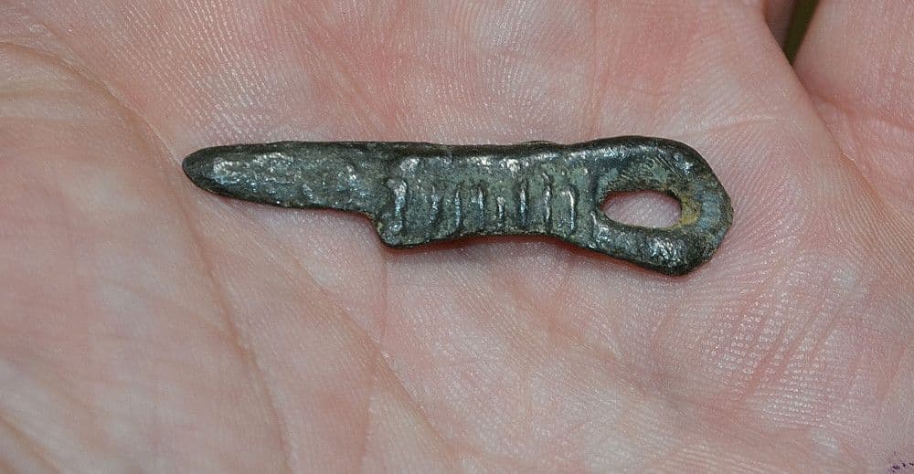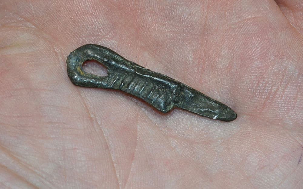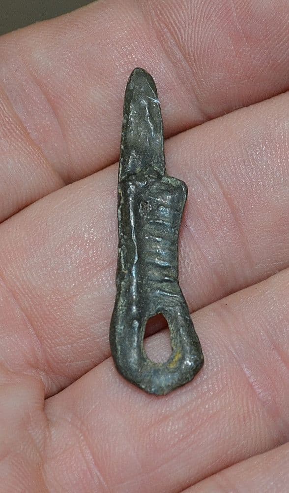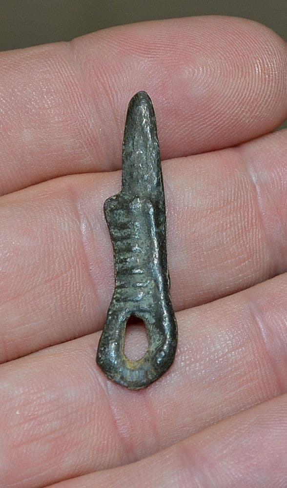 c.8th-10th Century A.D. A rare and unusual Viking lead Dagger pendant / Talisman, excavated in Northern Europe many years back and from a Norfolk collection. Bi-facial and expertly mould formed featuring clear detail of blade and handle; this Dagger pendant depicts the typical Northern Viking "drawn dagger" with the characteristic extruded metal handle folding back on itself to form a large looped handle, and also in this case forming a suspension loop for the pendant. Totally intact and in very good condition for Ancient lead with a pleasant shiny dark surface patination, Approx. 40mm long x 10mm wide, supplied in display box, a rare and unusual Viking lead pendant.