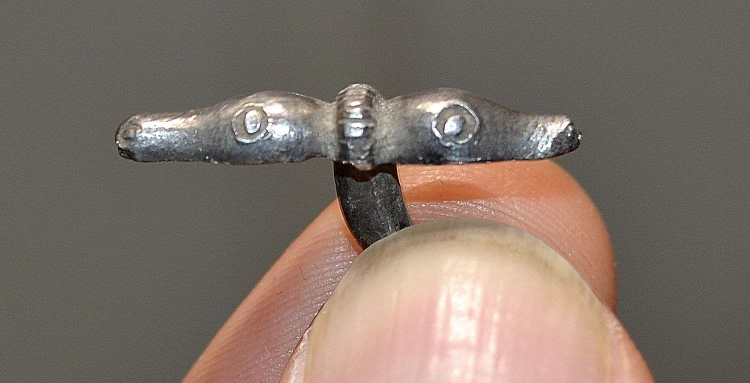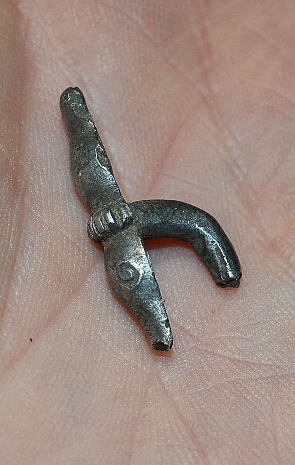 c.9th/10th Century A.D. A rare, excellent and large Viking silver "Dragonesque" decorative cloak pin head originally found in Britain and from a U.S. collection. A good sized solid silver decorative pin head in the form of two Dragons heads facing away from each other either side of a raised knurled decorative ridge. Each head featuring large engraved eyes and flared nostrils. The back of the pin head still has the right angled section from the large and thick silver cloak pin in-situ. Good bright silver, in very nice condition and a rare and interesting little piece of Viking jewellery, 26mm long x 6mm wide x 12mm deep.
