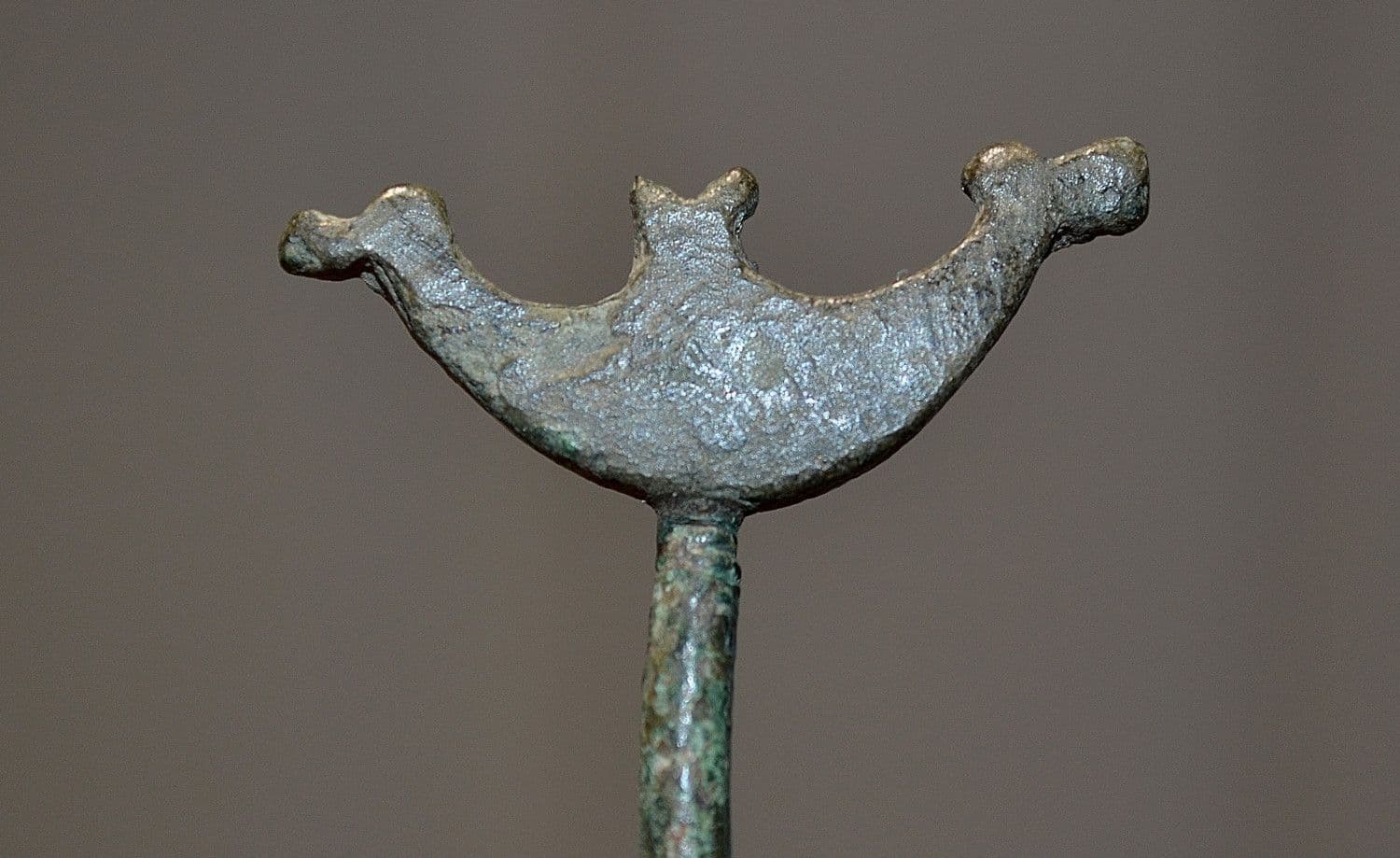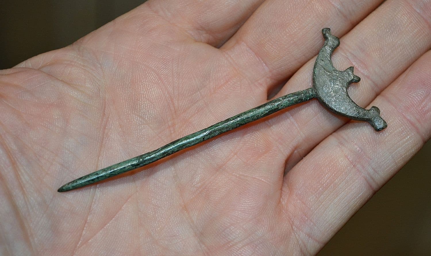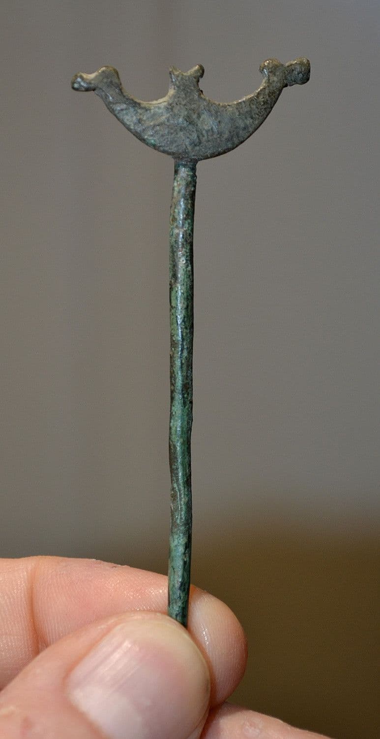 c.10th Century A.D. A very rare and excellent Viking "Boat headed" bronze cloak pin found in Northern Europe many years back and from a U.S. private collection. This rare and unusual item consists of a thick and robust bronze cloak pin topped with a stylised representation of a Viking long ship complete with Dragonesque heads on both the bow and stern. Totally intact and in excellent overall condition. Possibly once originally silvered or gilded but now purely bronze with a olive green surface patination, a seldom offered and appealing Viking artefact, 86mm long x 3mm diameter shank x Boat pin head 33mm across.