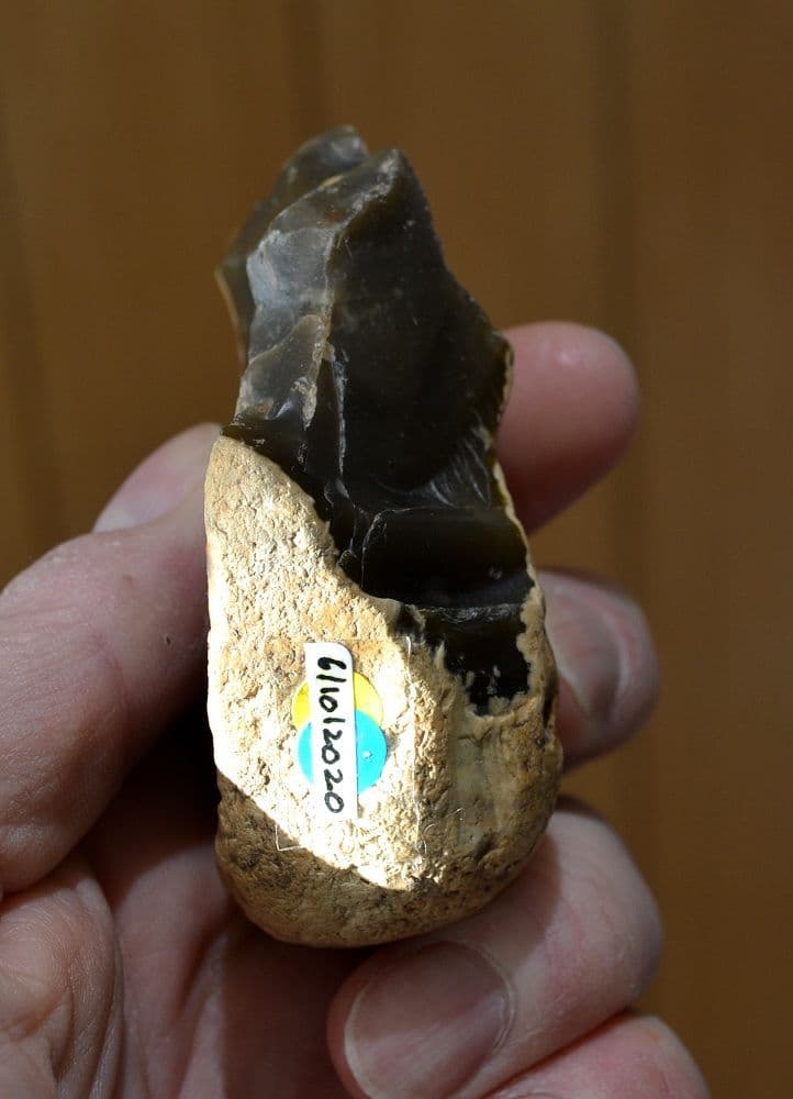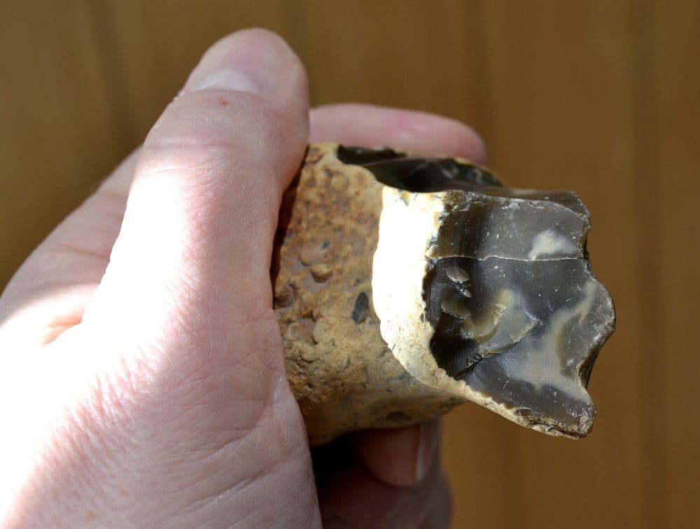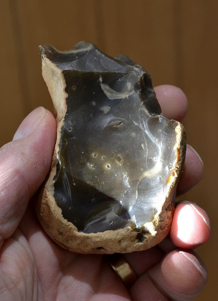 MIS13 - MIS11 c.531,000 to 420,000 B.C. An unusual Lower Palaeolithic "Dual-notched" flint scraper tool found on the banks of the River Stour at Harkstead, Suffolk and from an old Suffolk collection. Well worked for such an early tool and fashioned from a thick brown flint flake with original pebble cortex remaining on much of the tool to aide grip in use. This unusual flint tool has been bi-facially worked at its functional end to form two distinct, small but well defined concave notched blades and would most likely have been used for working fine wood, bone or antler items. A nice shiny old patina to worked surfaces, a sizable and very unusual Palaeolithic flint tool, 85mm long x 60mm wide x 35mm thick